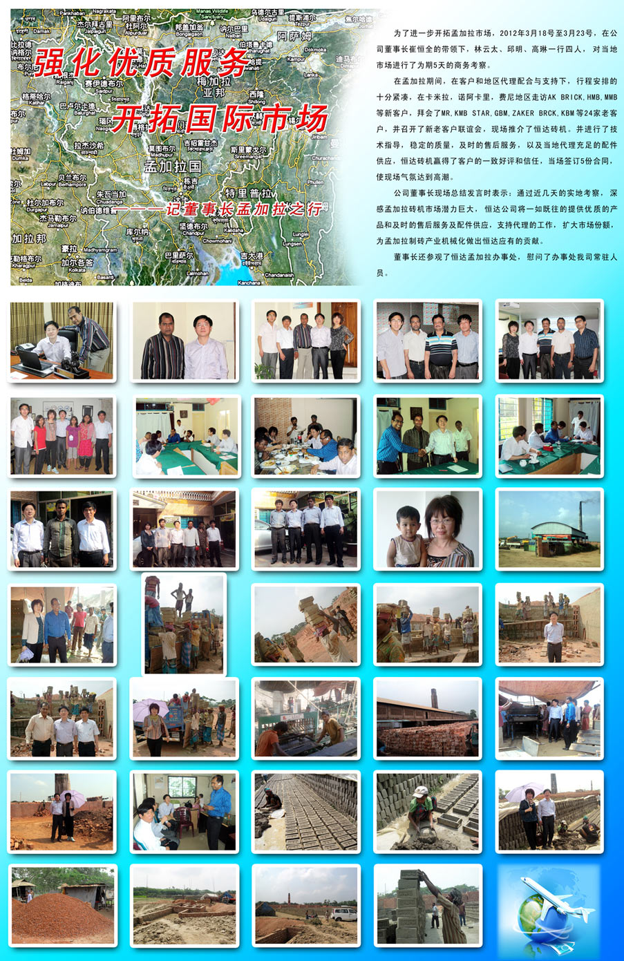 在孟加拉期間,公司得到了當(dāng)?shù)卮砩痰亩αχС,召開(kāi)了新老客戶聯(lián)誼會(huì),對(duì)當(dāng)?shù)厥袌?chǎng)的磚瓦行情進(jìn)行深入交流。當(dāng)前孟加拉多半還是手工制磚,而且國(guó)家已經(jīng)出臺(tái)了政策,截至2015年取消手工做磚。這對(duì)于公司來(lái)說(shuō)是個(gè)很大的機(jī)遇。但同時(shí),競(jìng)爭(zhēng)也是激烈的,各個(gè)磚機(jī)廠紛紛涌入孟加拉市場(chǎng),加強(qiáng)對(duì)當(dāng)?shù)厥袌?chǎng)的開(kāi)發(fā),可以說(shuō)機(jī)遇與挑戰(zhàn)并存的,這就要求公司要嚴(yán)抓產(chǎn)品質(zhì)量,加強(qiáng)售后服務(wù),爭(zhēng)取使我們的機(jī)器遍布孟加拉市場(chǎng)。